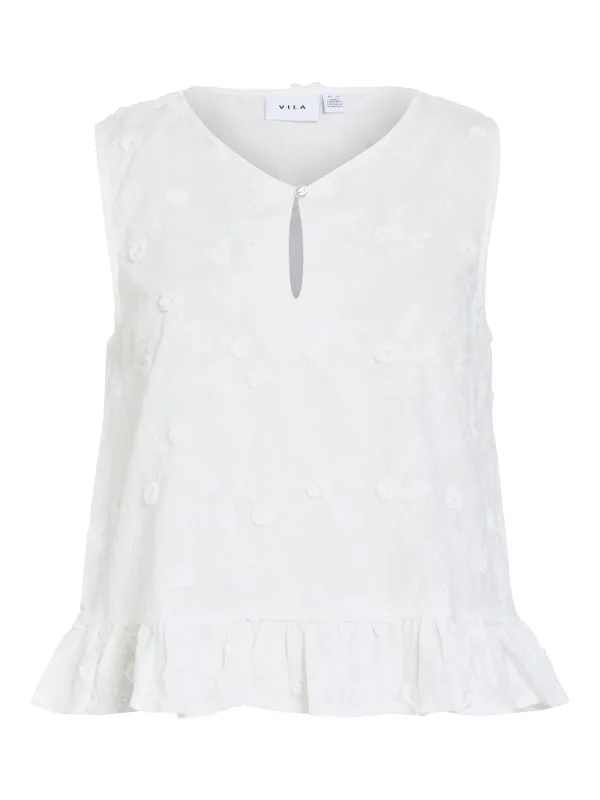 Blouse type: Blouseshirt; Design: Keyholesluiting; Type sluiting: Knoopsluiting; Materiaal: Katoen; Halstype: V-hals; Motief: Effen; Kraag: Tuniek kraag; Soort bandjes: Brede bandjes; Details: Borduursels, Volant; Extra's: Gestructureerd oppervlak; Pasvorm: Normale pasvorm; Armlengte: Mouwloos; Lengte: Normale lengte