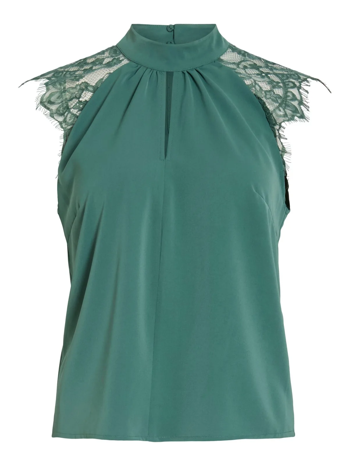Blouse type: Blouseshirt; Design: Gevoerde zoom/rand; Type sluiting: Knoopsluiting; Motief: Effen; Kraag: Opstaande kraag; Details: Cut-outs, Kant, Gedrapeerd; Extra's: Op staal naden; Pasvorm: Normale pasvorm; Armlengte: Mouwloos; Lengte: Normale lengte