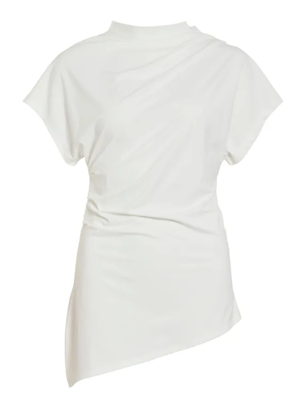 Blouse type: Blouseshirt; Design: Asymmetrische zoom, Staande kraag; Type sluiting: Slip; Halstype: Opstaande kraag; Motief: Effen; Kraag: Opstaande kraag; Details: Gedrapeerd; Extra's: Op staal naden, Voelt zacht aan; Pasvorm: Slanke pasvorm; Armlengte: Kwartmouw; Lengte: Lange pasvorm