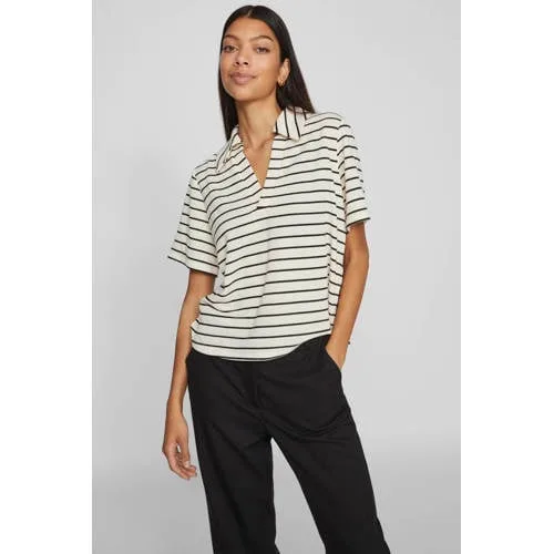 Voor een frisse, dagelijkse look is deze VILA dames top met V-hals een fijne basis in je garderobe. De ecru kleur met zwarte strepen geeft direct een rustig en modern effect, terwijl de open V-hals en klassieke kraag zorgen voor een nette, vrouwelijke uitstraling. De korte mouwen maken deze top ideaal voor zomerse dagen of laagjes in het voorjaar.Verfijnde details voor elke dag Ecru met zwarte streepprint voor een tijdloze, goed te combineren look Open V-hals met klassieke kraag voor een verzorgde uitstraling Korte rechte mouwen, prettig op warme dagen of onder een blazer Gemaakt van een soepele stof die prettig aanvoelt op de huid Valt normaal volgens het maatadvies, waardoor je je gebruikelijke maat kunt kiezen Onderhoudsvriendelijk: wasbaar op 30 graden en lauw strijkbaar Niet drogen in de droogtrommel, zo blijft de stof langer mooiMakkelijk te stylen, van kantoor tot casualDeze top past bij veel momenten in je week. Combineer met een zwarte pantalon voor een nette werkoutfit of met een jeans voor een meer ontspannen look. De lichte kleur en subtiele strepen maken het eenvoudig om te stylen met jouw favoriete vest, blazer of sandalen.VILA: eigentijdse mode met een zachte touchVILA staat bekend om vrouwelijke ontwerpen met een toegankelijke stijl. De collecties combineren frisse trends met draagbare pasvormen, waardoor je kleding kiest die mooi oogt en prettig draagt. Met deze top haal je een veelzijdig item in huis dat aansluit bij de herkenbare, moderne stijl van VILA.Een lichte, gestreepte basic die je het hele seizoen opnieuw uit de kast pakt.