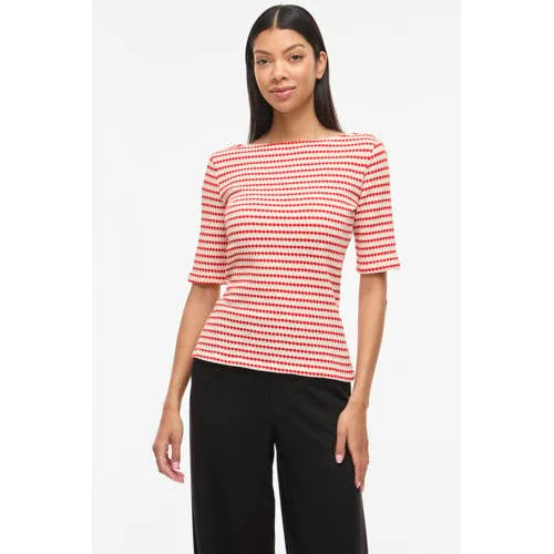 Voor een frisse, dagelijkse look is deze Vilopes Boat Neck 2/4 Top van VILA een fijne basic met een moderne twist. De rood met ecru strepen geven deze gestreepte damestop van VILA een tijdloze uitstraling, terwijl de boothals en korte mouwen zorgen voor een vrouwelijke, lichte fit. Gemaakt van katoen met viscose en een kleine hoeveelheid elastaan voelt de stof zacht en soepel aan op de huid.Details die je elke dag draagt Rood/ecru streepdessin voor een heldere, frisse uitstraling Boothals die subtiel de schouders accentueert Korte, rechte mouwen voor een luchtig gevoel Comfortabele stof met stretch door het elastaan Geschikt voor dagelijks gebruik in het 'Daily' assortiment van VILA Valt normaal, waardoor je je gebruikelijke maat kunt kiezen Eenvoudig te verzorgen, wasbaar op 30 graden en lauw strijkbaar Niet geschikt voor de droogtrommel om de vorm mooi te houdenCasual top voor alledaagse combinatiesDeze gestreepte top past gemakkelijk in je garderobe. In combinatie met een jeans en sneakers ontstaat een relaxte look voor doordeweeks. Met een nette broek of rok en sandalen is de top ook geschikt voor een meer geklede dag.VILA, Scandinavische eenvoudVILA staat bekend om moderne, vrouwelijke mode met een heldere en toegankelijke stijl. Het merk combineert Scandinavische eenvoud met draagbare ontwerpen die goed passen in het dagelijks leven. Met deze top haal je een betrouwbaar kledingstuk in huis dat je vaak en met plezier kunt dragen.Een veelzijdige basic die je garderobe rustig en overzichtelijk houdt, terwijl je toch verzorgd voor de dag komt.