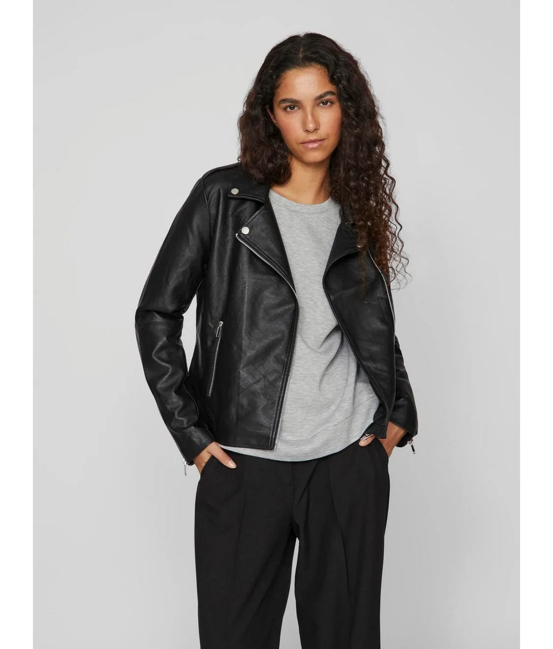 Bikerjack van VILA voor dames;Pure viscose;Recht model;Leerlook;Platte kraag met drukknopen;Schoudertrensjes;Asymmetrische ritssluiting;Ritszakken;Deelnaad;Ruglengte bij maat M: 53 cm;Schouderbreedte bij maat M: 36 cm;Mouwlengte bij maat M: 61 cm