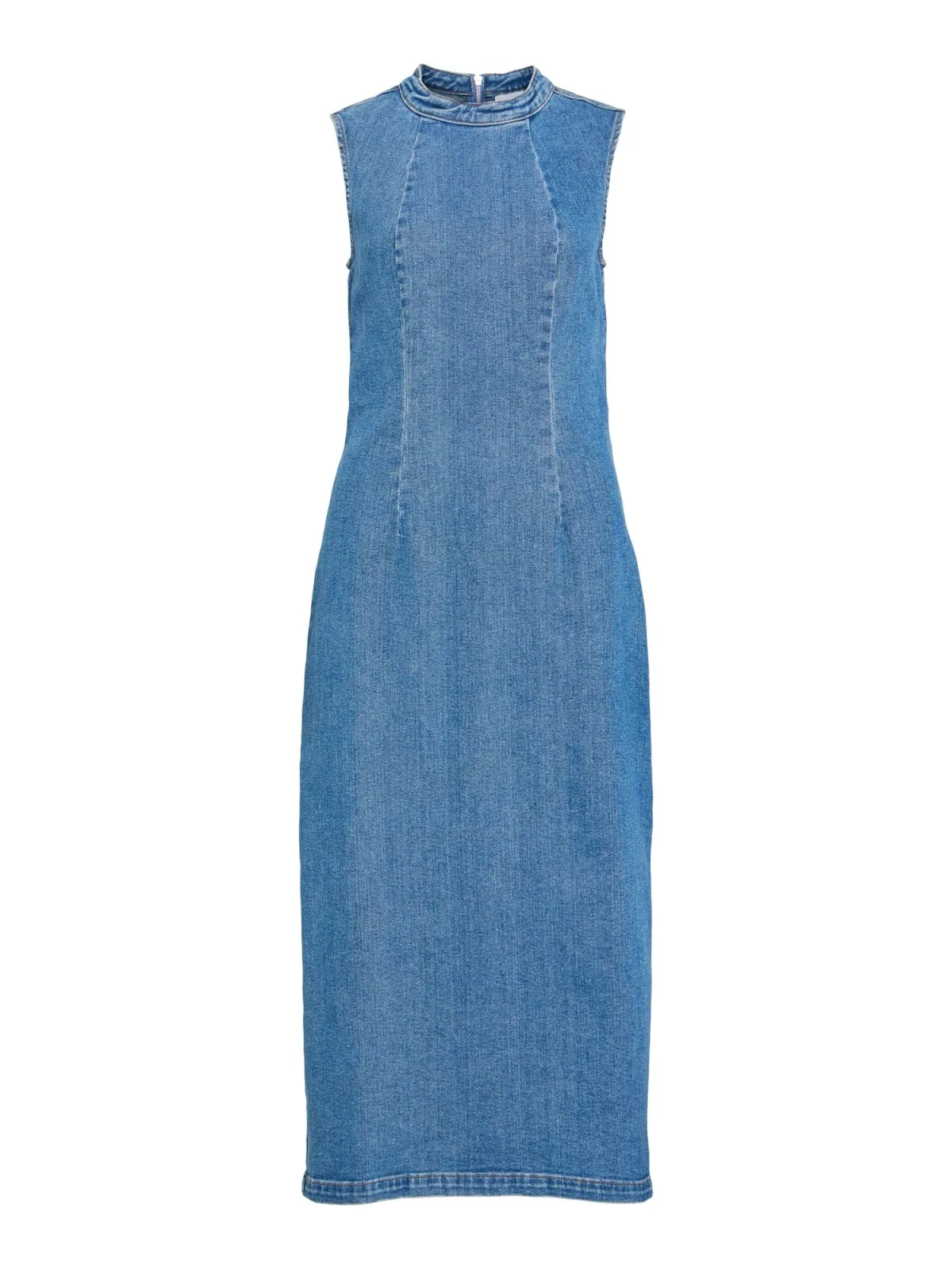 Design: Split; Type sluiting: Ritssluiting; Materiaal: Denim; Halstype: Opstaande kraag; Motief: Effen; Soort bandjes: Brede bandjes; Extra's: Vaste grip; Lengte: 3/4 lengte; Snit: Figuur omarmend; Pasvorm: Slanke pasvorm; Armlengte: Mouwloos