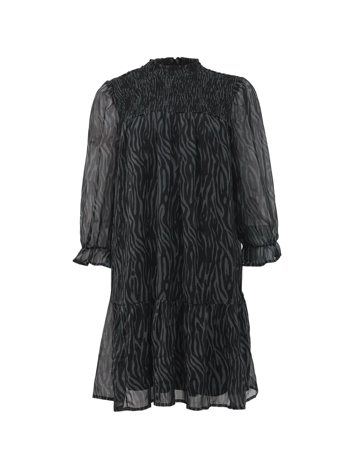 Design: Gevoerde zoom/rand, Elastische taille/zoom, Keyholesluiting; Type sluiting: Knoopsluiting; Materiaal: Gerecycled materiaal; Halstype: Opstaande kraag; Motief: Dierenprint; Details: Cut-outs, Volant, Gedrapeerd; Extra's: All-over patroon, Gladde stof; Lengte: Knielengte; Snit: Uitlopend; Pasvorm: Losse pasvorm; Armlengte: Driekwart mouw