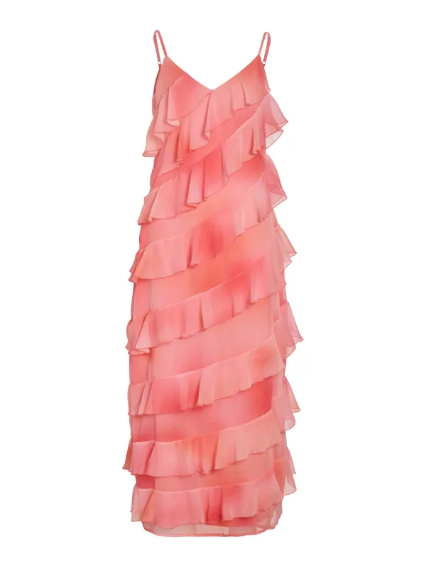 Design: Gevoerde zoom/rand, Beenopening; Type sluiting: Ritssluiting; Materiaal: Gerecycled materiaal; Halstype: V-hals; Motief: Kleurverloop; Soort bandjes: Spaghettibandjes; Details: Volant; Extra's: Lichte stof, Milieuvriendelijk geproduceerd; Lengte: 7/8 lengte; Snit: Getailleerd; Pasvorm: Slanke pasvorm; Armlengte: Mouwloos