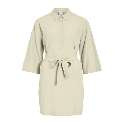 Deze ecru korte jurk van VILA is een rustige basis voor elke dag in het voorjaar. De jurk heeft een klassieke kraag en een knoopsluiting aan de voorkant, wat zorgt voor een nette, verzorgde uitstraling. Dankzij de driekwart mouwen en de rechte mouwinzet voelt het model luchtig, maar toch aangekleed. De bijpassende ceintuur in de taille geeft een vrouwelijk silhouet en laat je zelf bepalen hoe aangesloten je de jurk wilt dragen.Verzorgde look met subtiele details Kort model dat tot boven de knie valt, geschikt voor dagelijkse outfits Effen ecru kleur die makkelijk combineert met sandalen, laarsjes of sneakers Klassieke kraag en knoopsluiting voor een klassieke, geklede uitstraling Driekwart mouwen met rechte mouwinzet voor een comfortabele pasvorm Ceintuur in de taille om het model naar wens te tailleren Geen zakken voor een slank, rustig silhouetIdeaal voor dagelijkse momentenDeze korte jurk komt goed tot zijn recht in het dagelijks leven. Denk aan een werkdag op kantoor, een lunchafspraak of een dagje shoppen. In de lente draag je er eenvoudig een lichte jas overheen en met blote benen of een dunne panty pas je de look aan aan het weer.VILA: eigentijdse mode voor elke dagVILA staat voor vrouwelijke, toegankelijke mode met een moderne uitstraling. De collecties zijn ontworpen met aandacht voor pasvorm en details, zodat je outfits kunt samenstellen die passen bij verschillende momenten van de dag. Deze jurk kun je het hele seizoen door dragen, bijvoorbeeld met blote benen in het voorjaar of met een panty als het frisser is.Een rustige, ecru jurk die goed aansluit bij een basisgarderobe.