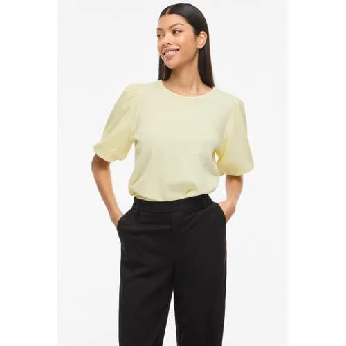 Deze lichtgele top van Vila is een must-have voor elke vrouw! Gemaakt van duurzaam gerecycled katoen, polyester en elastaan, is deze top niet alleen stijlvol, maar ook milieubewust. De korte mouwen en ronde hals maken het een perfecte top voor zonnige dagen. Combineer het met een jeans en sneakers voor een casual look of draag het met een rok en hakken voor een chique uitstraling. Deze top is verkrijgbaar in verschillende maten en is een veelzijdige toevoeging aan je garderobe. Verspil geen tijd en voeg deze prachtige top toe aan je kledingcollectie!
