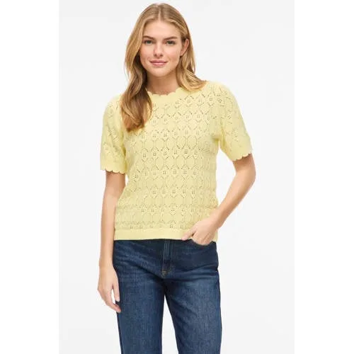 Deze lichtgele gebreide dames top van katoen van VILA is een basic voor elke dag in het voorjaar. De top heeft korte rechte mouwen en een ronde hals, waardoor het model rustig oogt en makkelijk combineerbaar is. Het open breisel geeft een subtiel patroon en zorgt voor een luchtig gevoel op de huid, ideaal als de temperaturen stijgen.Details die je elke dag draagt Lichtgeel dessin in effen kleur, gemakkelijk te stylen met jeans, pantalon of rok Gemaakt van 90% katoen / 10% nylon voor een zachte touch met fijne vormvastheid Open breisel dat lucht doorlaat, prettig voor de lente en mildere dagen Korte rechte mouwen voor een ontspannen, verzorgde uitstraling Ronde hals die mooi aansluit zonder te strak te zitten Valt normaal volgens het maatadvies, handig bij het kiezen van je gebruikelijke maat Onderhoudsvriendelijk: wasbaar op 40 graden, lauw strijkbaar en niet in de droogtrommelLuchtige knit voor het dagelijks levenDeze top uit de 'Daily' collectie is gemaakt om vaak te dragen. Combineer hem met een high waist jeans voor een casual look of met een nette broek voor je werkdag. Door het open breisel komt een topje of bh subtiel door, wat extra diepte in je outfit geeft.VILA: moderne mode met een frisse blikVILA staat bekend om vrouwelijke ontwerpen met een ontspannen, moderne uitstraling. De collecties sluiten aan op het dagelijks leven, met items die je eenvoudig combineert en regelmatig draagt. Je kiest voor mode die goed aansluit op een actieve dagindeling.Een lichte, luchtige knit die goed past bij het voorjaar.