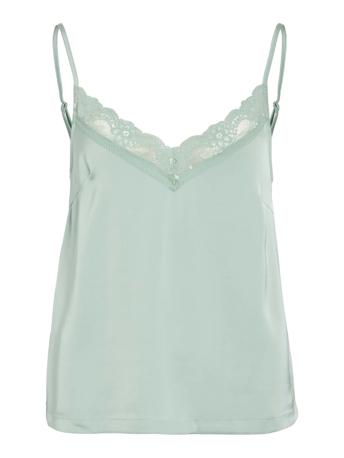 Design: Gevoerde zoom/rand; Materiaal: Satijn; Halstype: V-hals; Motief: Effen; Soort bandjes: Spaghettibandjes; Details: Kant; Extra's: Verstelbare bandjes, Lichte stof; Pasvorm: Losse pasvorm; Armlengte: Mouwloos; Lengte: Normale lengte