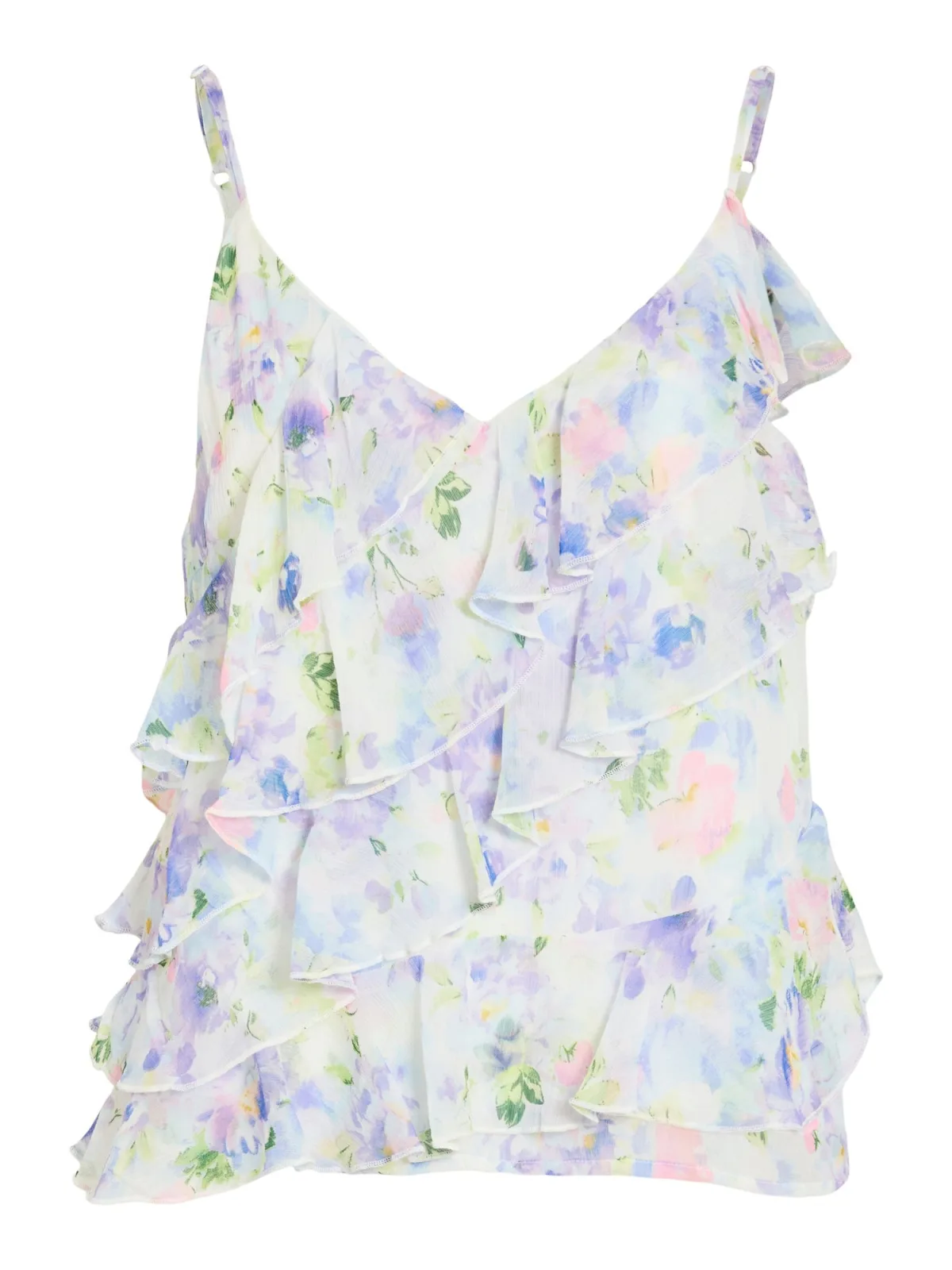Design: Verborgen rits; Materiaal: Gerecycled materiaal; Halstype: V-hals; Motief: Bloemenprint; Soort bandjes: Spaghettibandjes; Details: Volant; Extra's: Verstelbare bandjes, All-over patroon; Pasvorm: Normale pasvorm; Armlengte: Mouwloos; Lengte: Normale lengte