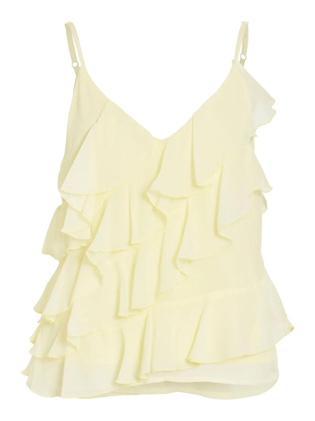 Design: Gevoerde zoom/rand; Materiaal: Gerecycled materiaal; Halstype: V-hals; Motief: Effen; Soort bandjes: Spaghettibandjes; Details: Volant; Extra's: Op staal naden; Pasvorm: Normale pasvorm; Armlengte: Mouwloos; Lengte: Normale lengte