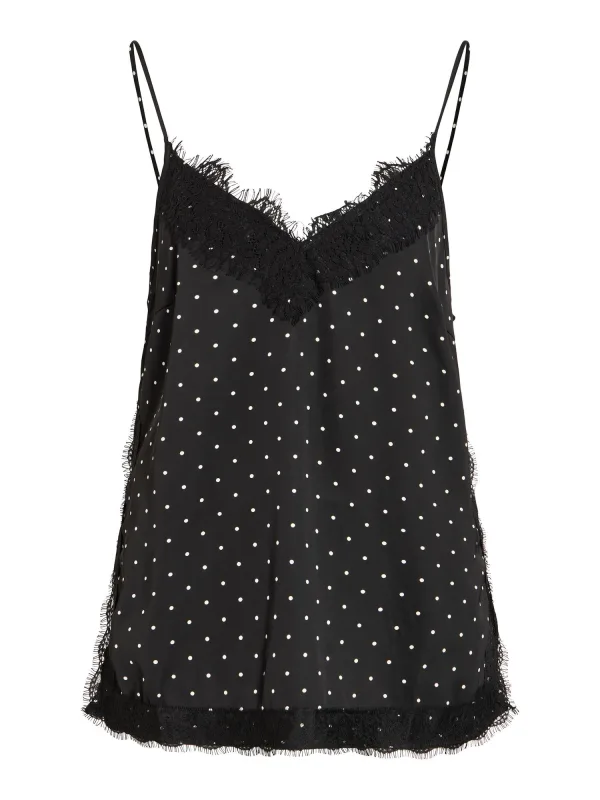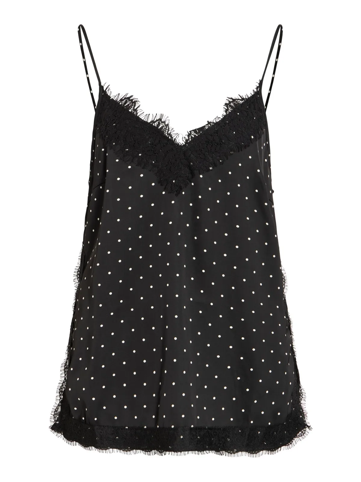 Design: Zoom/rand met boord; Materiaal: Satijn; Halstype: V-hals; Motief: Gestippeld; Soort bandjes: Spaghettibandjes; Details: Kant; Extra's: All-over patroon; Pasvorm: Normale pasvorm; Armlengte: Mouwloos; Lengte: Normale lengte