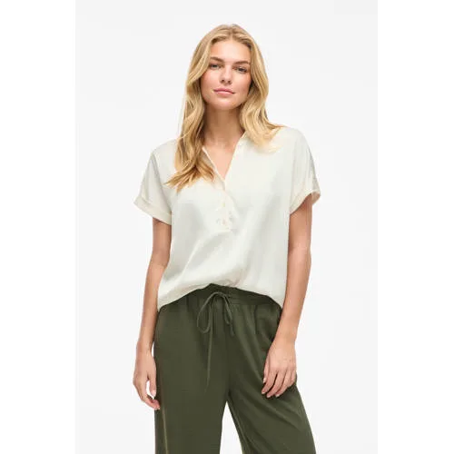 Deze VILA VIENNA top heeft korte mouwen en een klassieke kraag. De top is gemaakt van 100% polyester satijn en heeft rechte mouwen en een knoopsluiting. Je draagt dit item makkelijk bij verschillende outfits.
