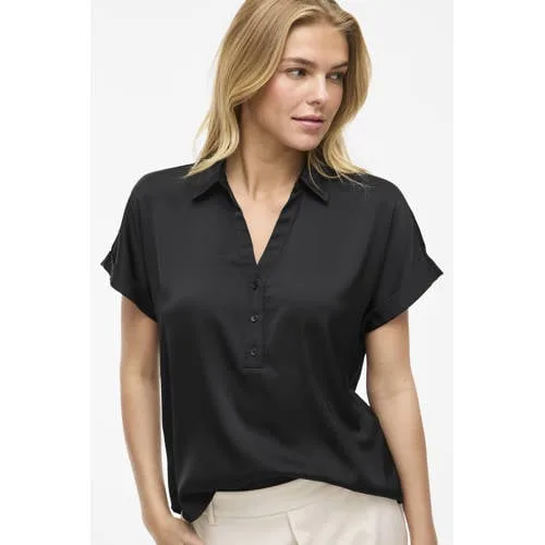 Deze VILA VIENNA top heeft een korte mouw en een klassieke kraag. De top is gemaakt van 100% polyester satijn, sluit met knopen en heeft rechte mouwen voor een eenvoudige uitstraling.