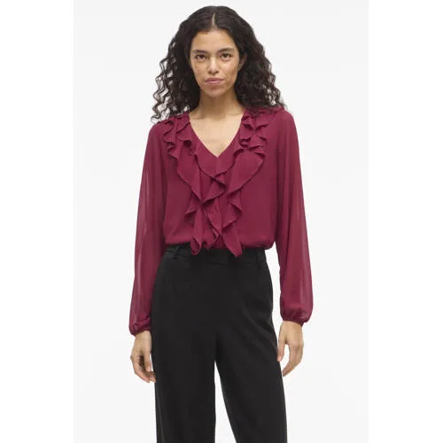 Deze VILA top heeft een klassieke kraag en een knoopsluiting. De top is gemaakt van polyester en heeft lange mouwen. Met ruches op de voorkant geef je jouw outfit een extra detail.