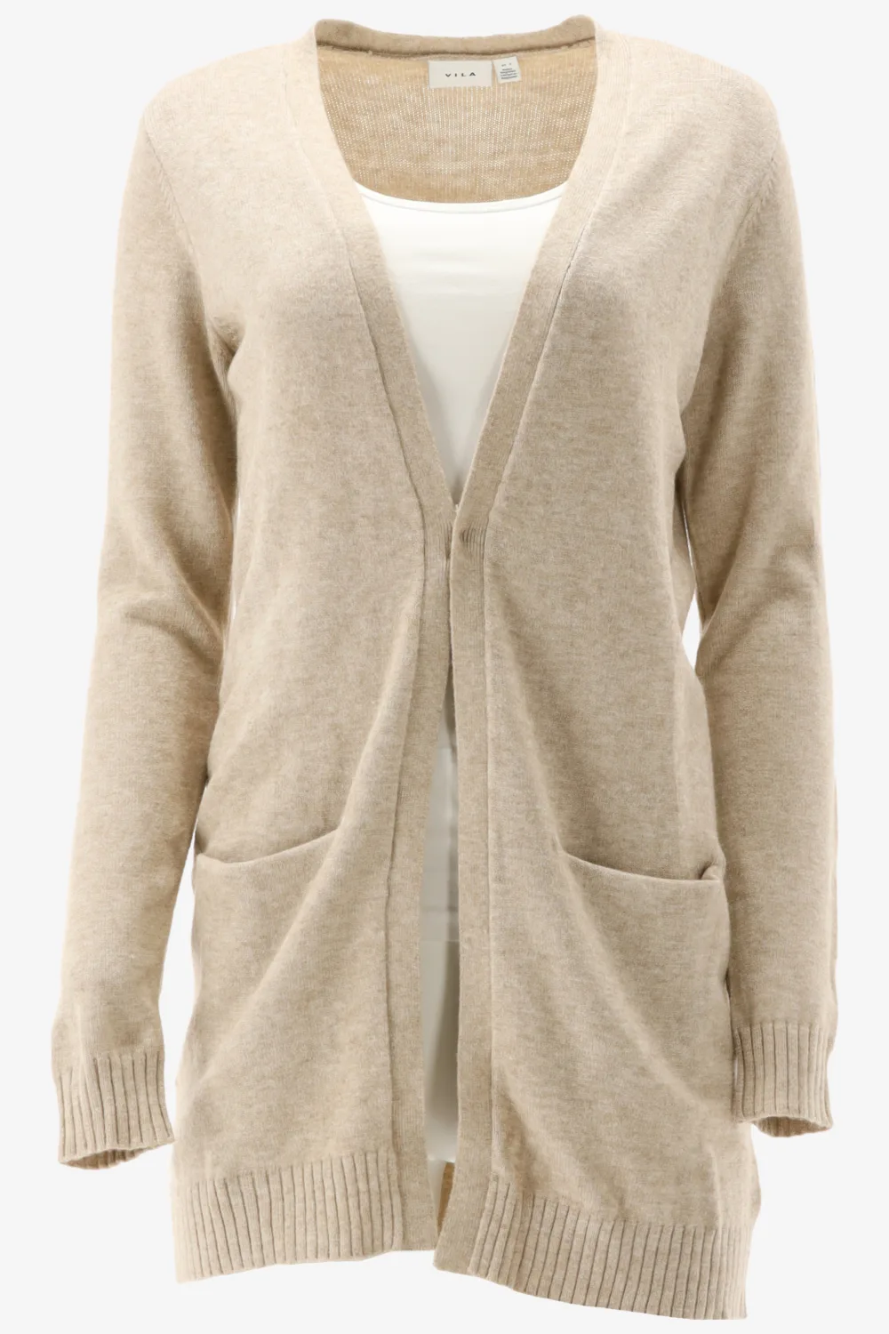 Gebreide damescardigan van VILA;Viscosemix;Recht model;Model 'VIRIL';Opengewerkte voorkant;Steekzakken;Ruglengte bij maat S: 76 cm;Mouwlengte bij maat S: 65 cm