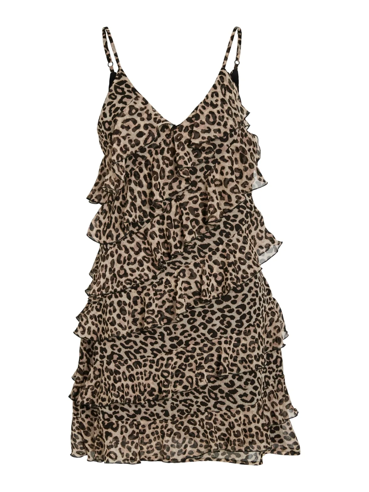 Design: Gevoerde zoom/rand, Diepe snit/decolleté; Materiaal: Gerecycled materiaal; Halstype: V-hals; Motief: Dierenprint; Soort bandjes: Spaghettibandjes; Details: Volant; Extra’s: All-over patroon, Lichte stof; Lengte: Kort/mini; Snit: Getailleerd; Pasvorm: Normale pasvorm; Armlengte: Mouwloos