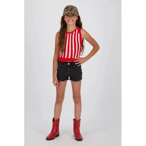 De Vingino meisjes top Ginny geeft elke outfit direct een frisse, zomerse uitstraling. Deze mouwloze gebreide top in rood met wit heeft een open breisel en speelse strepen, geschikt voor schooldagen, weekendafspraken of een dagje weg. De rechte pasvorm en ronde hals maken het tot een basic die makkelijk combineert met korte broek, jeans of rok.Frisse gebreide top met streep Mouwloze top met ronde hals, geschikt voor warme dagen of onder een jasje Gebreide kwaliteit met open breisel voor een luchtig en comfortabel gevoel Rood wit streepdessin dat goed zichtbaar is Gemaakt van acryl en viscose, voelt zacht en soepel aan op de huid Zonder sluiting, zodat de top eenvoudig over het hoofd aan en uit gaat Onderdeel van de Vingino Daily collectie, passend bij zowel schoolkind als tiener Onderhoudsvriendelijk: wasbaar op 40 graden, hangend drogen en niet strijkenPraktisch in dagelijks gebruikDeze Ginny top is ontworpen voor dagelijks gebruik. De lichte, gebreide structuur ondersteunt een actieve dag, terwijl de mouwloze snit veel bewegingsvrijheid geeft. Fijn op een zomerse dag en ook goed te combineren met een vest of denim jack erover wanneer het frisser wordt.Vingino en oog voor detail in kidswearVingino staat voor kinderkleding met eigentijdse ontwerpen en een stevige basis in pasvorm en kwaliteit. Elk item is ontworpen zodat kinderen zich vrij kunnen bewegen en zichzelf kunnen zijn, met aandacht voor praktische details.Een praktische top die moeiteloos meebeweegt met de dagelijkse avonturen.