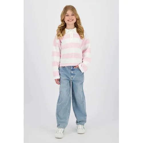 Deze Vingino sweater Jorien heeft mouwen en een streepprint. De sweater heeft een kraag en een knoopsluiting. Deze sweater is gemaakt van sweat materiaal van 100% katoen en heeft een stevige stof.