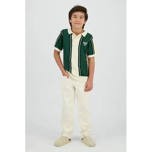 Dit Vingino jongens T shirt Muck is een comfortabele basic met een verzorgde uitstraling. De groene en ecru strepen geven een rustig sportief effect, terwijl de polokraag het T shirt iets netter laat ogen. De korte mouwen maken dit model geschikt voor warme dagen of als laagje onder een vest. Het T shirt is gemaakt van 100 procent katoen en heeft een gebreide structuur die zacht aanvoelt.Doordachte details voor dagelijks gemak Polokraag met knoopsluiting voor een nette maar ontspannen uitstraling Groen ecru streepdessin over het hele T shirt Korte mouwen voor veel bewegingsvrijheid Gemaakt van 100 procent katoen voor een prettig draaggevoel Gebreide kwaliteit voor een soepele en vormvaste stof Zonder borstzak voor een rustig voorpand Te dragen als los T shirt of onder een trui of vestVingino als vertrouwde keuzeVingino richt zich op kinderkleding met een eigentijdse stijl en praktische details. De pasvormen zijn afgestemd op actieve kinderen, zodat kleding prettig zit tijdens school, spelen en onderweg. Door de combinatie van herkenbare designs en degelijke materialen biedt Vingino kleding die steeds opnieuw gedragen kan worden.Met dit T shirt Muck van Vingino ontstaat eenvoudig een verzorgde en comfortabele outfit voor elke dag.