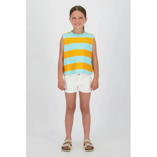 Klaar voor zonnige dagen, dit Vingino meisjes T-shirt is een praktische basic met een opvallend kleuraccent. De lichtblauwe en oranje strepen geven elke outfit direct een frisse uitstraling. De mouwloze pasvorm met rechte schouderlijn houdt het shirt luchtig, ideaal voor warme dagen op school, op vakantie of tijdens het spelen buiten.Licht en comfortabel voor elke dag Gemaakt van 100% katoen, wat zacht aanvoelt op de huid en prettig draagt, ook bij gevoeligere huid. Mouwloos model met rechte schouderlijn voor veel bewegingsvrijheid tijdens rennen, klimmen en sporten. Lichtblauw met oranje streepprint voor een zomerse uitstraling. Ronde hals die makkelijk over het hoofd gaat en prettig aansluit zonder te strak te zitten. Geen zakken voor een rustig geheel dat goed te combineren is.Makkelijk te combineren in haar garderobeDit T-shirt past goed bij een korte broek, rok, legging of jeans. De kleuren laten zich eenvoudig combineren met zowel neutrale tinten als fellere kleuren, waardoor het shirt vaak uit de kast gepakt kan worden.Vingino voor actieve kinderenVingino ontwerpt kinderkleding met een herkenbare stijl en comfortabele fits. De modellen zijn afgestemd op kinderen die graag bewegen en zich vrij willen voelen, zonder in te leveren op uitstraling.Een luchtig T-shirt waarin zij zich de hele dag vrij kan bewegen.