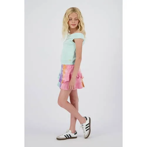 deze Vingino Ilena top heeft korte mouwen en een off shoulder kraagvorm de top is gemaakt van modal katoen en elastaan hierdoor voelt jouw kind zich prettig tijdens het dragen en blijft het goed zitten