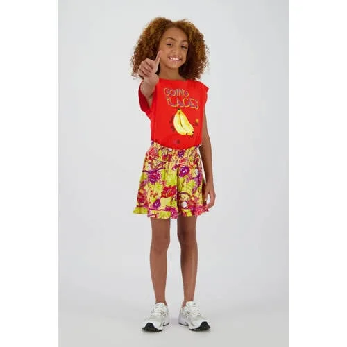 Deze Vingino korte broek voor meisjes heet Rina en heeft een regular pasvorm. Gemaakt van 100% viscose in een zomergele en rode kleur. De broek heeft een elastische tailleband en stijlvol smockwerk. Casual en comfortabel.