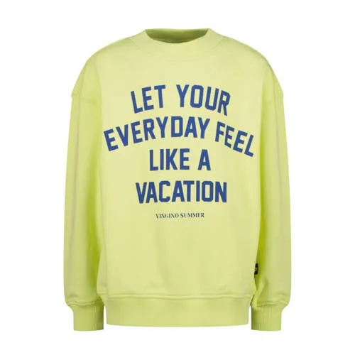 Voor een relaxte en stoere dagelijks outfit is deze Vingino sweater jongens een comfortabele keuze. De trui heeft een ronde hals en lange mouwen, ideaal voor schooldagen, buitenspelen of een rustige middag thuis. Gemaakt van 100% katoen voelt de sweater zacht aan op de huid en is prettig om de hele dag te dragen.Comfort met een sportieve uitstraling Gemaakt van 100% katoen, zacht en ademend voor dagelijks gebruik Lange mouwen zodat de armen goed warm blijven Ronde hals die gemakkelijk over het hoofd gaat Geen sluiting voor snel en eenvoudig aan- en uittrekken Stoere tekstprint die de sweater een sportieve look geeft Zonder zakken voor een rustige en moderne uitstralingIdeaal voor schooldagen en vrije tijdDeze sweater past goed bij een jeans, jogpant of korte broek. Door het rechte, makkelijke model kan er eenvoudig een T-shirt onder worden gedragen. Handig op frissere dagen of als extra laag in combinatie met een jas.Vingino: herkenbare stijl voor kidsVingino staat bekend om kinderkleding met een casual en stoere look, geïnspireerd op denim en streetwear. De ontwerpen zijn afgestemd op actief gebruik en beweging, met materialen die prettig dragen. Zo sluit deze sweater goed aan bij het dagelijks leven van kinderen.Een comfortabele basis in de kast die vaak uit de lade zal worden gepakt.