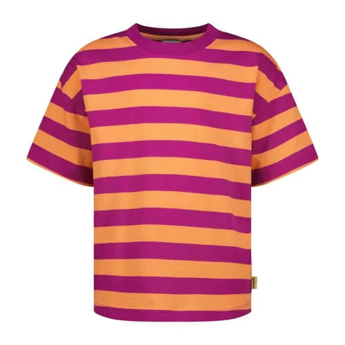 Dit Vingino meisjes T-shirt in fuchsia en oranje voegt eenvoudig kleur toe aan elke outfit. De horizontale strepen vallen duidelijk op en de zachte tricot van 100% katoen voelt prettig aan op de huid. Geschikt voor school, een dagje uit of om in te relaxen thuis. De ronde hals en korte, rechte mouwen zorgen voor een comfortabele pasvorm waar makkelijk in bewogen kan worden.Vrolijk T-shirt met strepen Gemaakt van 100% katoen voor een zachte, ademende kwaliteit Fuchsia/oranje streepprint voor een kleurige uitstraling Korte, rechte mouwen die soepel meebewegen Ronde hals die prettig aansluit zonder te knellen Geen zakken, waardoor het T-shirt mooi glad valt Los te dragen of in de broek of rok te steken voor een andere stijlElke dag makkelijk te combinerenDit T-shirt past goed bij een korte broek, jeans of rok. Het lichte katoen is prettig op warmere dagen en kan op frisse momenten eenvoudig onder een vest of spijkerjack worden gedragen. Zo blijft het een bruikbaar basisitem voor het hele seizoen.Vingino voor actieve kidsVingino staat bekend om kinderkleding met een herkenbare stijl en comfortabele fits. De designs zijn afgestemd op actief gebruik, met oog voor details en materialen die geschikt zijn voor dagelijks dragen.Een kleurrijke basis in de kledingkast, klaar voor iedere dag vol beweging.