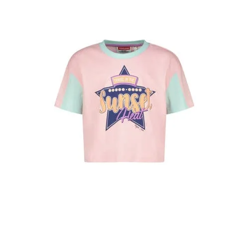 Dit Vingino T-shirt voor meisjes heeft de stijlvolle naam Hannelijn. Dit roze en mintgroene shirt heeft een ronde hals en een korte mouw. Het is gemaakt van 100% katoen voor een comfortabele pasvorm.