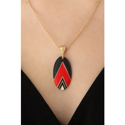 ''A work of art!'' Deze ketting is uitgevoerd in goudkleurig messing met een art deco geïnspireerde hanger voorzien van mat emaille in oranjeood, zwart en crème. * Messing (antiek goudkleurig metaal) * Handbeschilderd emaille * Verstelbare karabijnsluiting met bedeltje * Hypoallergeen * Nikkelvrij * Combineer met de bijpassende oorbellen om je look compleet te maken