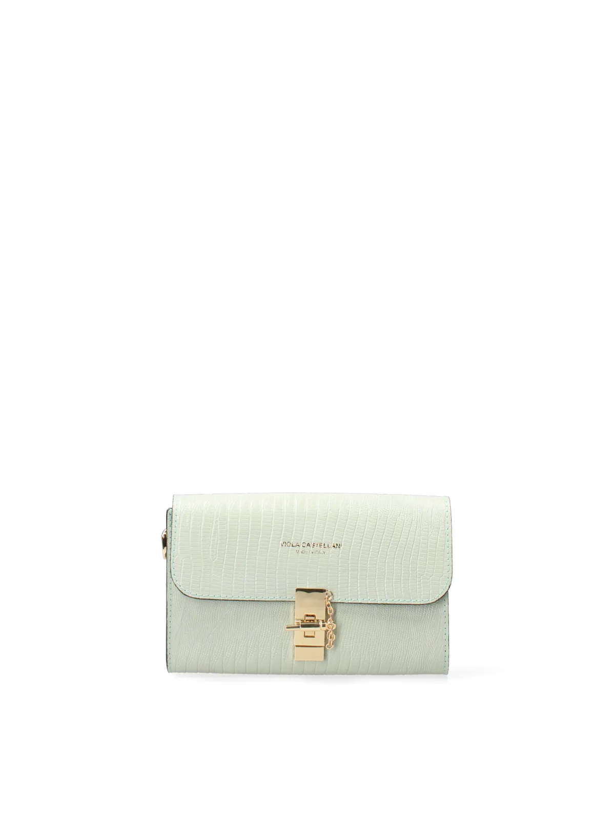 Crossbodytas voor dames met draaisluiting. één met binnenzakken met ritssluiting. afwezige externe zakken. afneembaar op kettingschouderband. ontbrekend handvat. twee binnenvakken. extern materiaal. gevoerd met 70% katoen - 30% polyester binnenkant. Afmetingen: 23x13x5 cm. Gemaakt in Italië