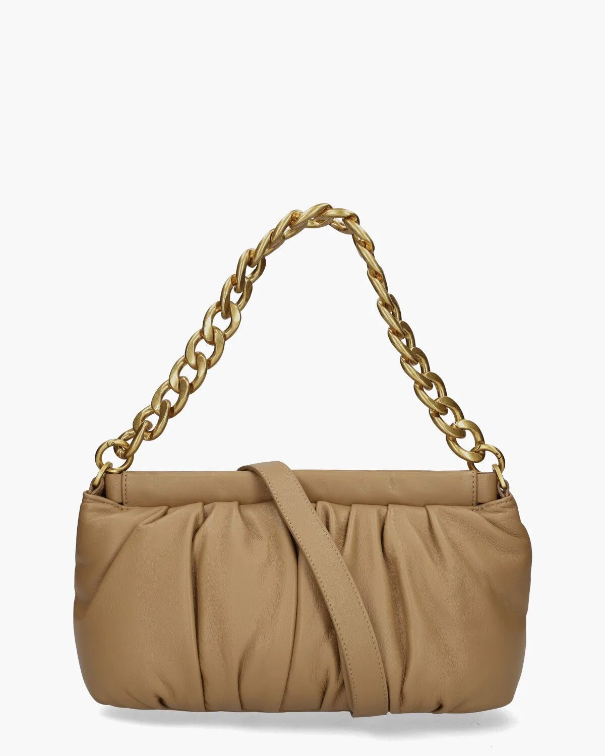 Compact tasje Amy Silky uit de collectie van Les Visionnaires. Dit model is gemaakt van bruin zacht geplooid leer. De bag heeft 1 compartiment met daarin 3 steekvakjes en een ritsvak. De tas sluit met een magneet. Het gouden chainhengsel is afneembaar. Een langere verstelbare en afneembare schouderband wordt meegeleverd. is. Afmetingen: