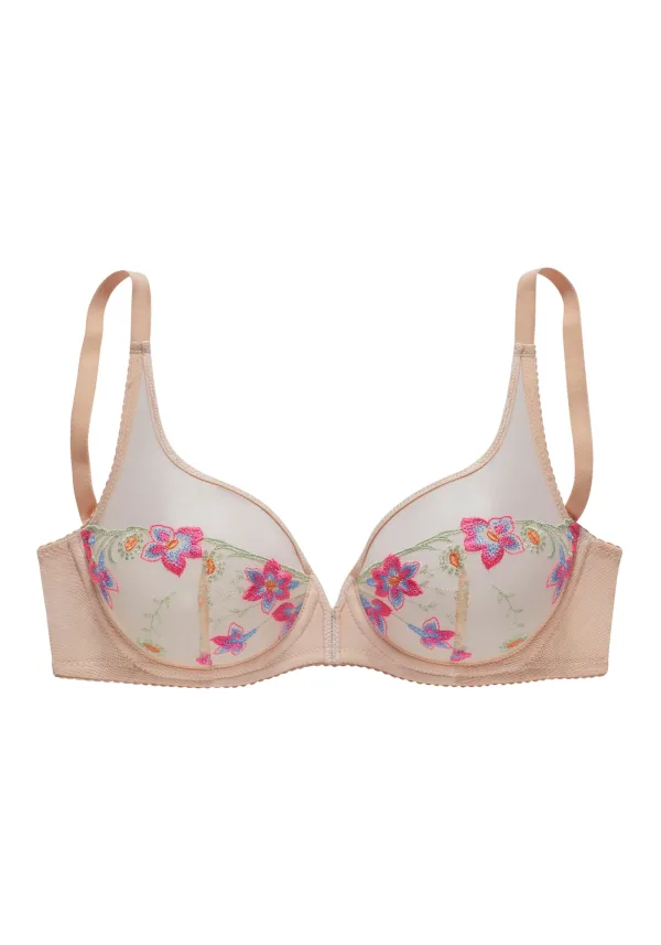 Cup soorten: Full cup bh; Soort bandjes: Normale bandjes; Bh/bikini type: T-shirt; Beugel: Met beugel; Motief: Bloemenprint; Details: Borduursels