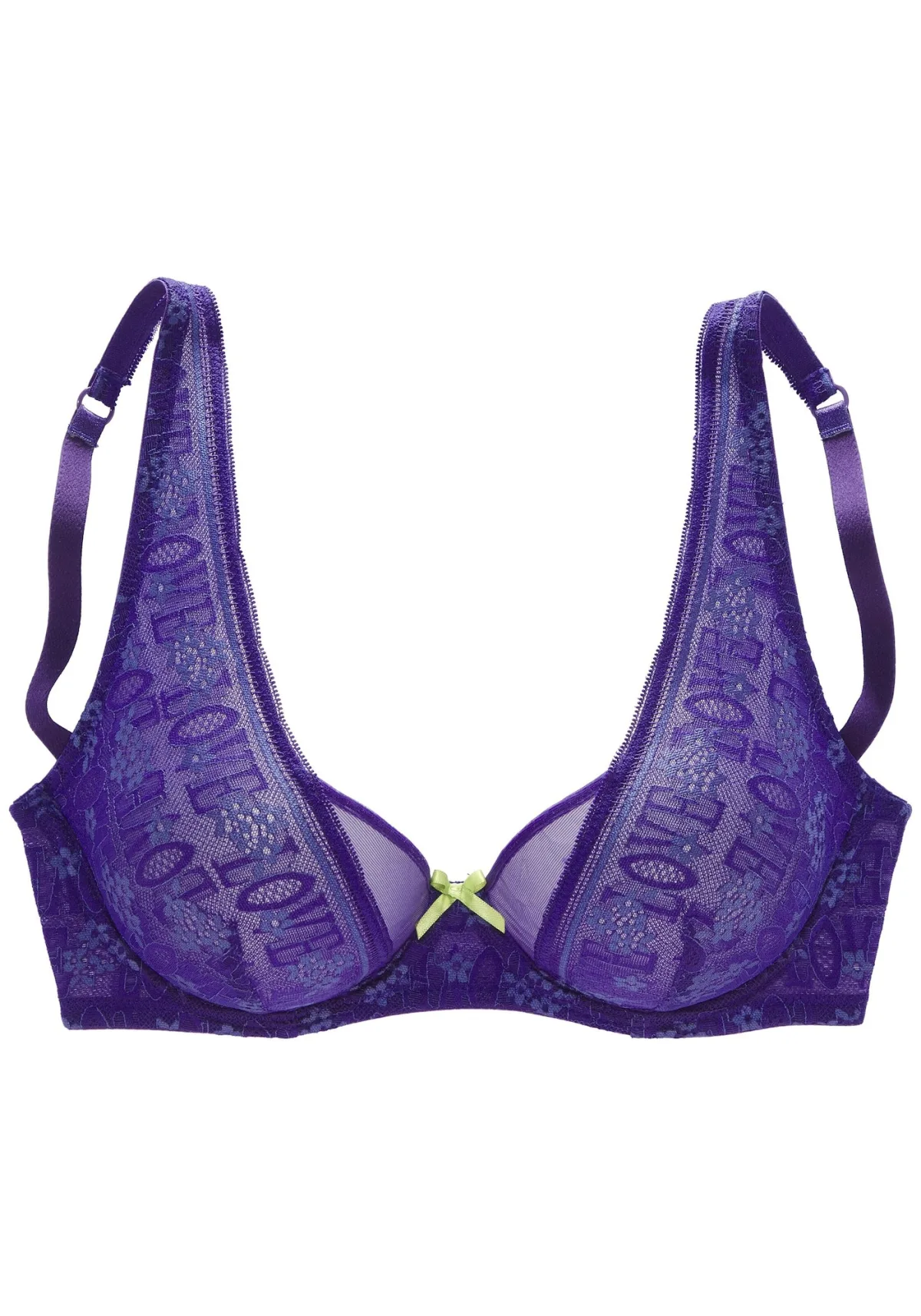 Cup soorten: Demi cup bh; Soort bandjes: Normale bandjes; Bh/bikini type: Balconette; Beugel: Met beugel; Design: Elastische taille/zoom; Type sluiting: Haakjes; Motief: Tekst print; Details: Kant; Extra's: Verstelbare bandjes