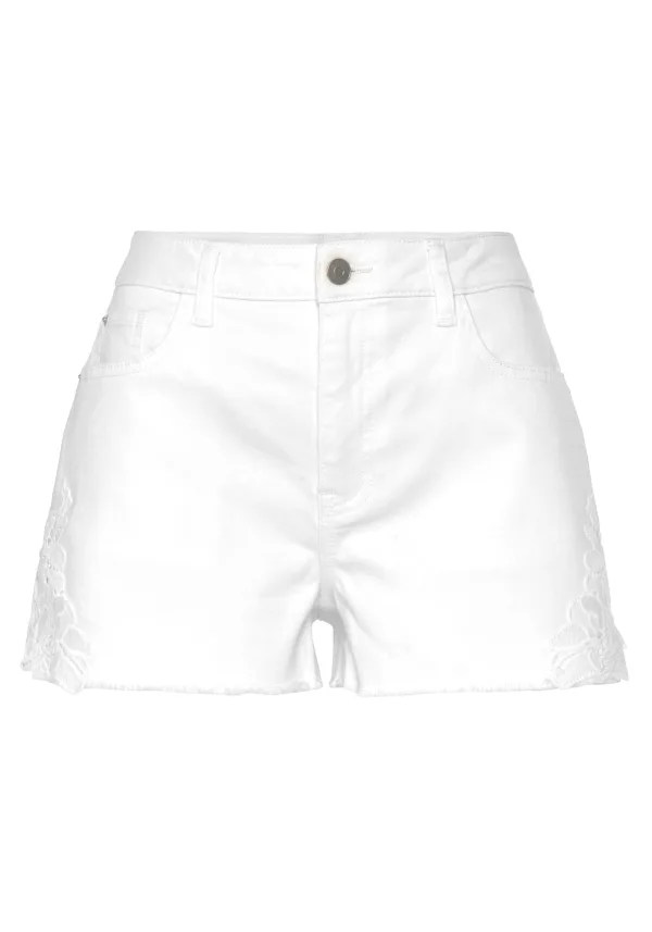 Design: 5-pocket-style; Type sluiting: Knoopsluiting; Materiaal: Denim; Motief: Bloemenprint; Details: Kant; Extra's: Studs, Op staal naden; Wassing: Colored denim; Lengte: Kort/mini; Pasvorm: Loosefit; Taillehoogte: Mid waist