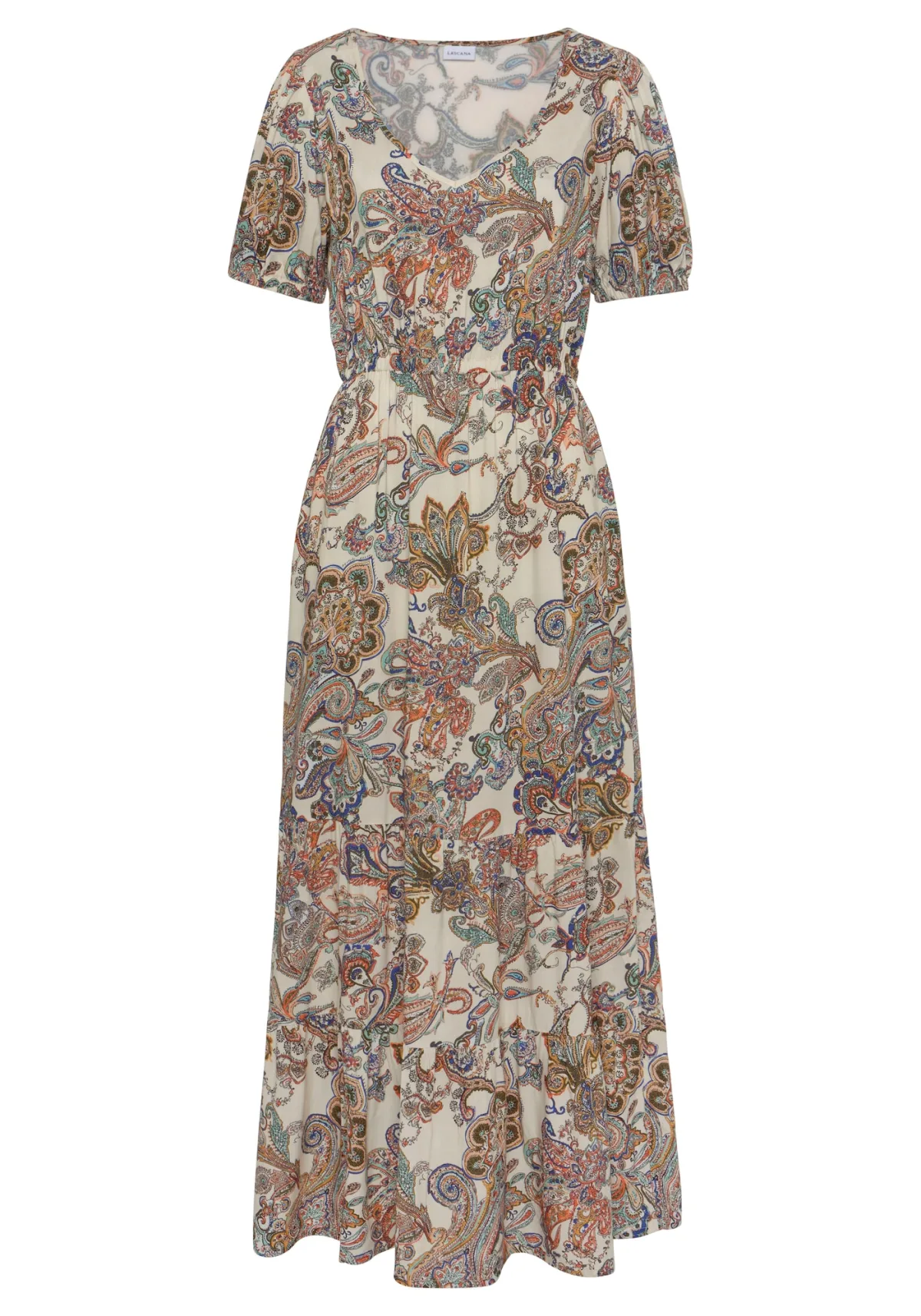 Design: Getailleerd model; Materiaal: Viscose; Halstype: V-hals; Motief: Paisley; Details: Volant; Extra's: All-over patroon, Fully fashioned; Lengte: Lang/maxi; Snit: Getailleerd; Pasvorm: Normale pasvorm; Armlengte: Halve mouw