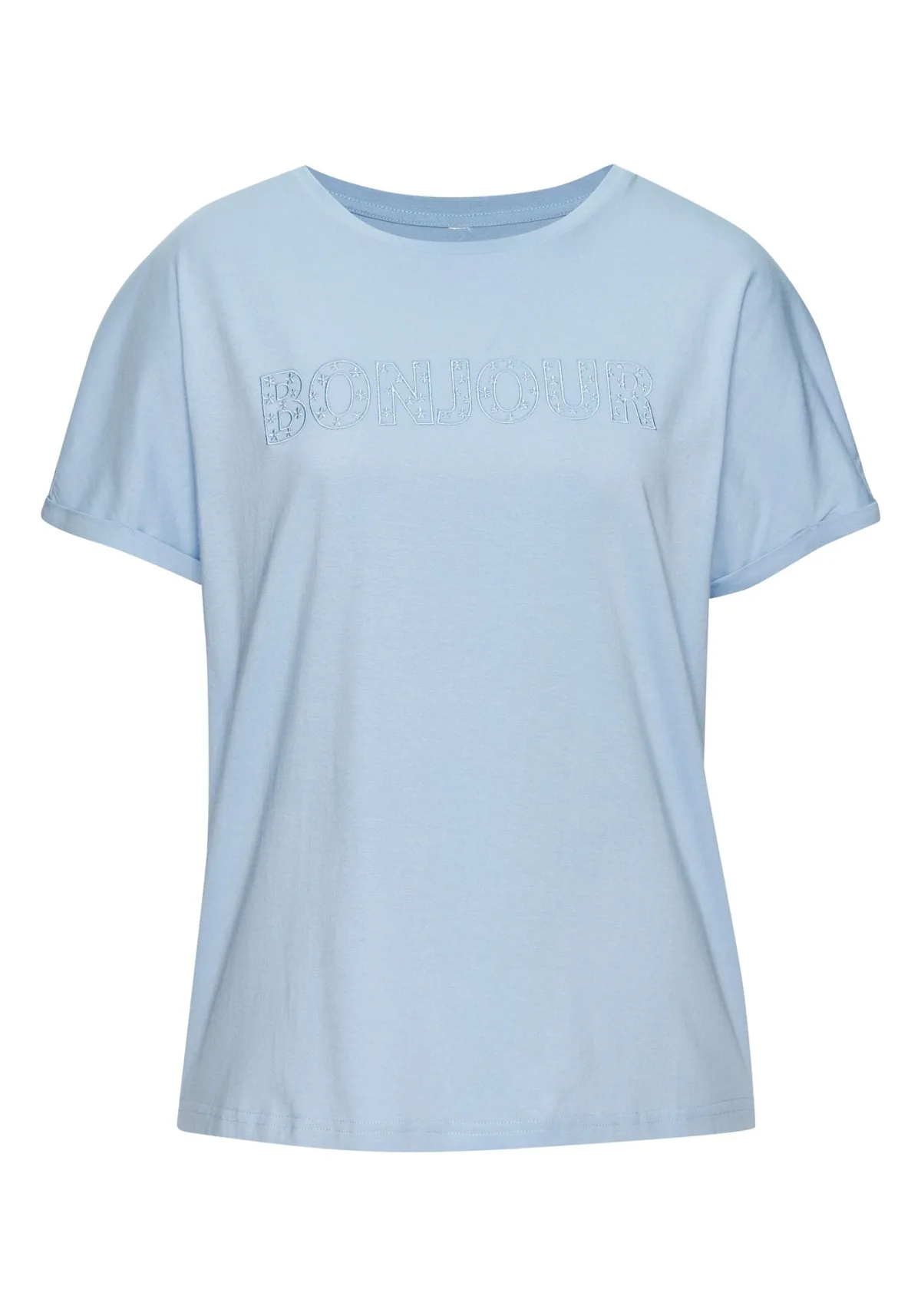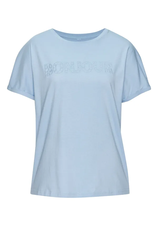 Design: Gesneden mouw, Mouw revers; Materiaal: Jersey; Halstype: Ronde hals; Motief: Tekst print; Details: Borduursels; Extra's: Lichte stof; Pasvorm: Losse pasvorm; Armlengte: Kwartmouw; Lengte: Normale lengte