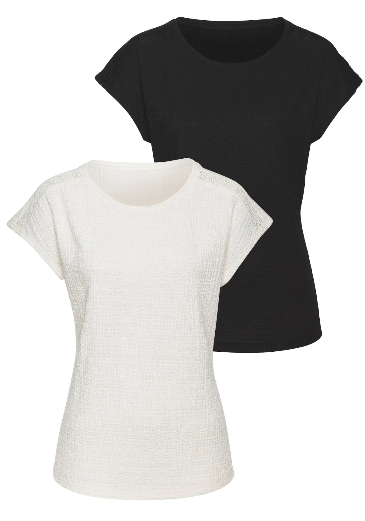 Blouse type: Blouseshirt; Design: Gesneden mouw; Materiaal: Crêpe; Halstype: Ronde hals; Motief: Effen; Kraag: Zonder kraag; Details: Kant; Extra's: Voelt zacht aan; Pasvorm: Normale pasvorm; Aantal: 2 Pack; Armlengte: Kwartmouw; Lengte: Normale lengte
