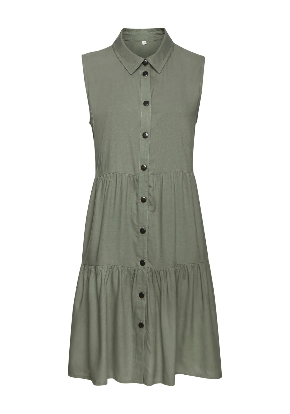 Design: Knop placket, Knop sluiting, Losvallend model; Type sluiting: Knoopsluiting; Materiaal: Viscose; Motief: Effen; Details: Volant, Gedrapeerd; Extra's: Op staal naden; Lengte: Knielengte; Snit: Uitlopend; Pasvorm: Losse pasvorm; Armlengte: Mouwloos