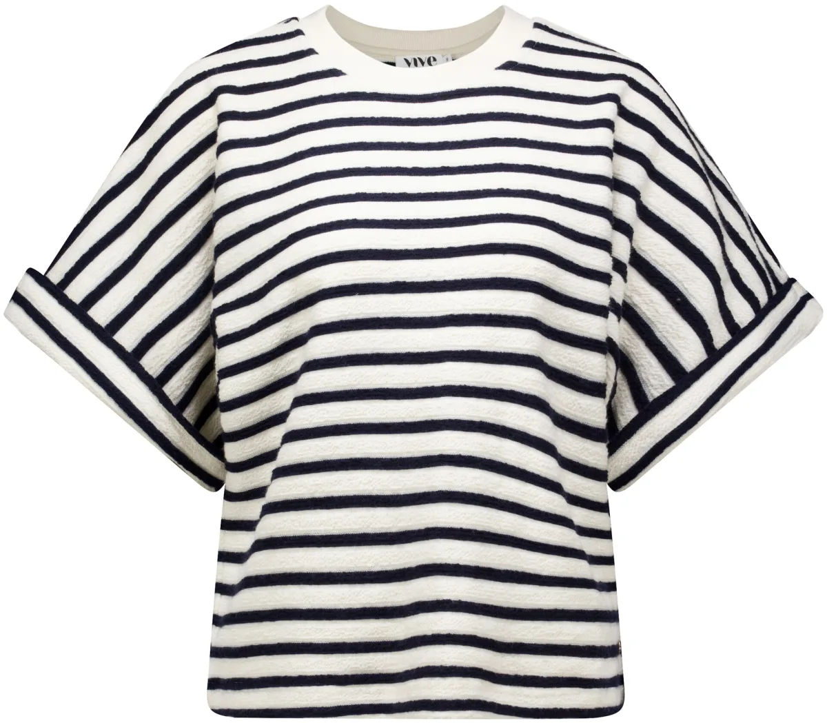 De Sweater Alya van Vive La Femme is een casual dames sweater met een losse pasvorm en korte mouwen. Het ontwerp heeft een klassieke ronde hals en een stijlvol streeppatroon, perfect voor een ontspannen gelegenheid. Comfort en mode komen samen in deze tijdloze must-have.