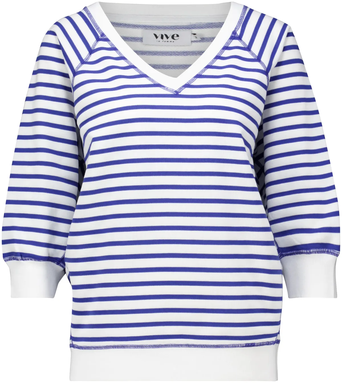 Sweater Bloem van Vive La Femme is een stijlvolle sweater met een casual uitstraling. Het comfortabele comfort fit ontwerp heeft een V-hals en driekwartmouwen, perfect voor diverse gelegenheden. De opvallende streepprint maakt dit tot een veelzijdig en modieus item binnen dames sweaters.