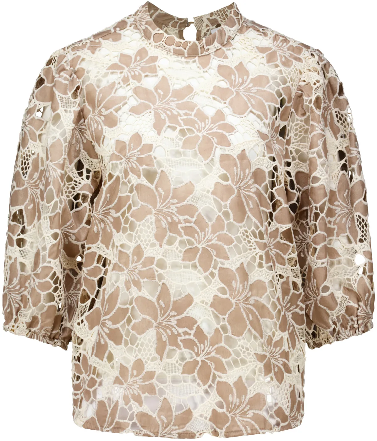 De Top Bo van Vive La Femme is een elegante dames top korte mouw met een vrouwelijke uitstraling. De top heeft pofmouwen, een opstaande kraag en een losse pasvorm. Het bloemen- en gaatjespatroon geeft een stijlvolle, casual touch aan elke gelegenheid.