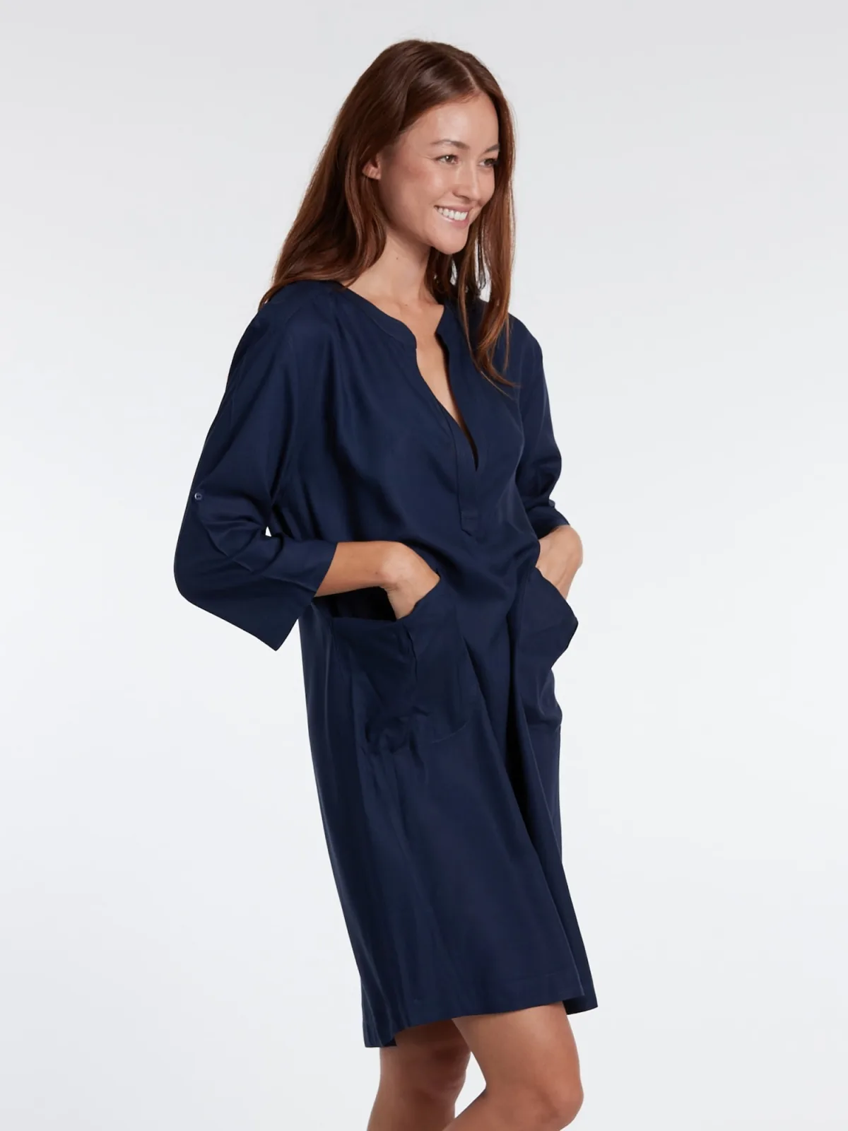 Design: Overcut schouder, Opgezette zakken; Materiaal: Viscose; Motief: Effen; Extra's: Op staal naden, Gladde stof; Lengte: Knielengte; Snit: Recht; Pasvorm: Losse pasvorm; Armlengte: Driekwart mouw