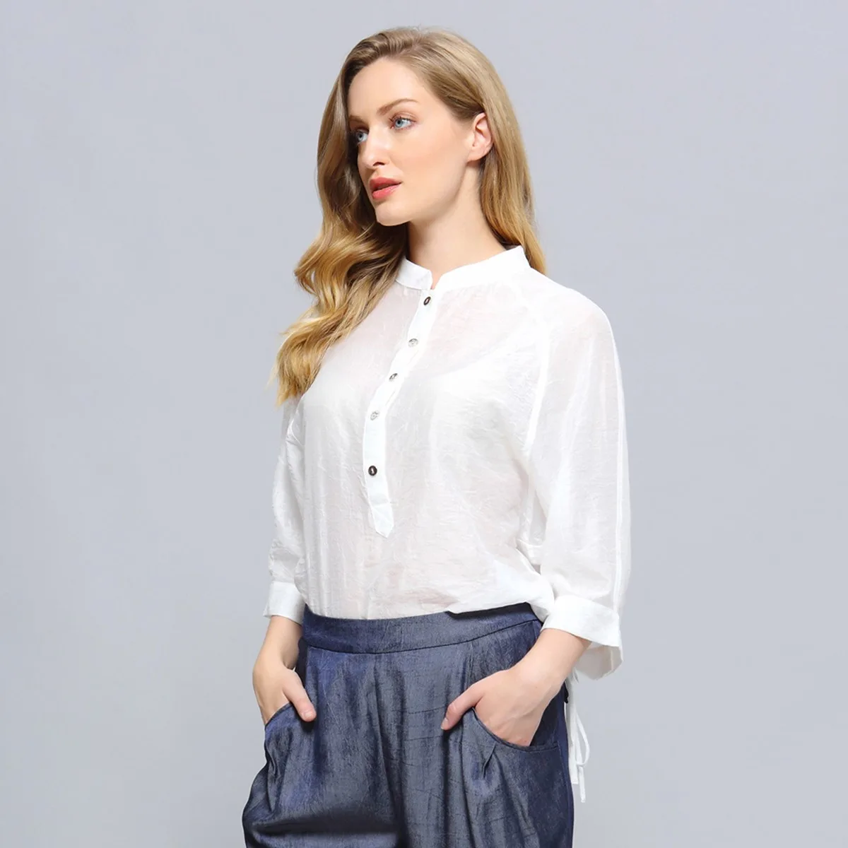Een tijdloos en minimalistisch stuk, dit shirt heeft prachtig gestructureerde en ademende stof, zeer zacht op de huid. Met een kanaal achterin kunt u de vorm op uw gemak verzamelen. Brede raglan vleermuismouwen, los snijden; Een echt moeiteloze pasvorm die u kunt matchen met veel verschillende items. Om op het werk te dragen of tijdens je weekend escapades. Een must in je garderobe. Productengegevens • Vorm: blousy • Lengte: 61 cm • ¾ Raglan -mouwen • Rechte standaardkraag • Midden voorgeknoopt