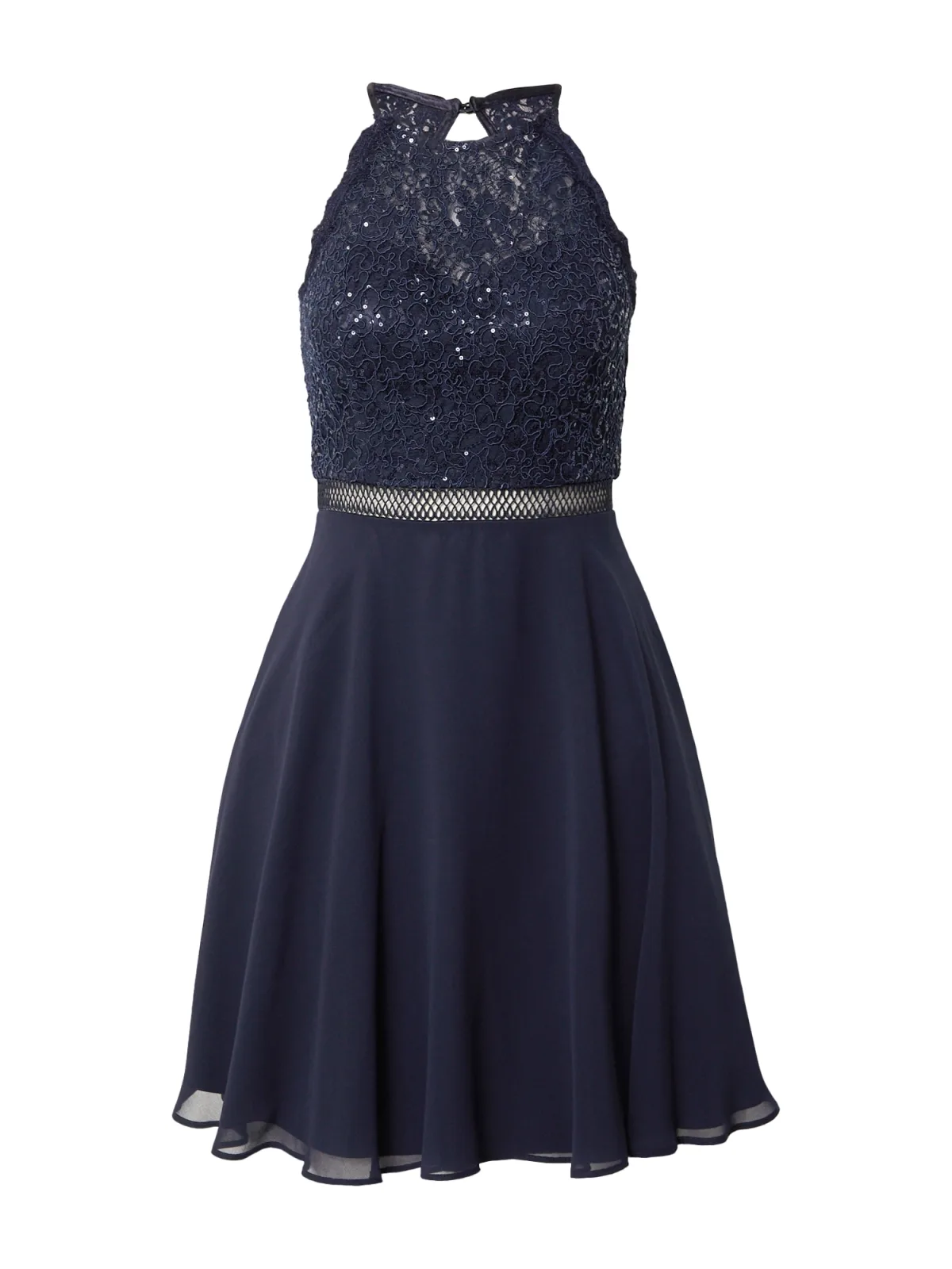Design: Gevoerde zoom/rand, Rug rits; Type sluiting: Knoopsluiting; Halstype: Ronde hals; Motief: Effen; Soort bandjes: Haltermodel; Details: Cut-outs, Pailletten, Kant, Mesh, Backless; Extra's: Op staal naden, Gladde stof; Lengte: Kort/mini; Pasvorm: Normale pasvorm; Armlengte: Mouwloos