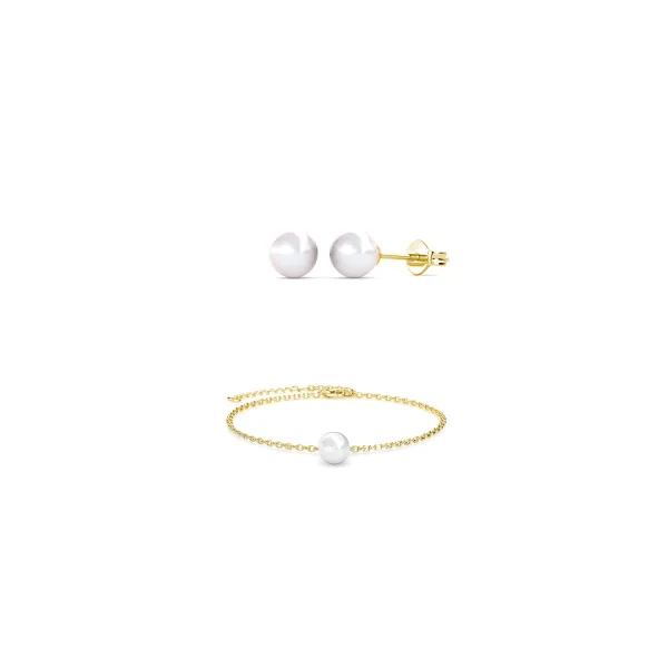 Samenstelling: Messing Afwerking: 18k verguld Steensoort: Imitatieparel Steenkleur: Kristal Diameter oorbellen (mm): 6 Lengte armband (mm): 180 + 55