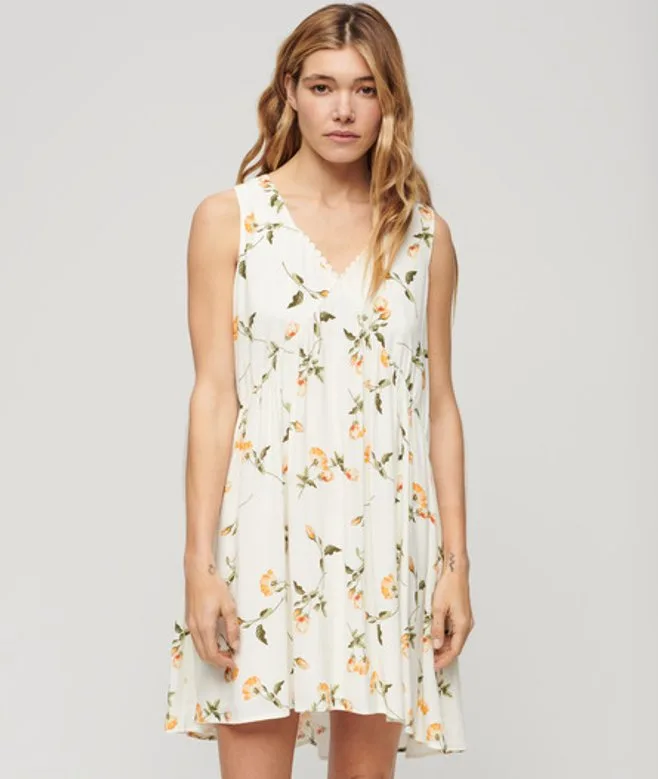 Een elegante zomerjurk, perfect om overdagén 's avonds te dragen. De Volume mouwloze jurk beweegt perfect met zijn lichtgewicht en sierlijke ontwerp en voegt een vleugje verfijning toe aan je garderobe. Casual in combinatie met sneakers of elegant voor aan de cocktailbar: stijlpunten gegarandeerd. Relaxte pasvorm - de klassieke Superdry-pasvorm. Niet te nauwsluitend, niet te ruim, precies goed. Kies je gebruikelijke maat UK10 schouder tot zoom: 90 cm Knoopsluiting Uitsnijding aan de achterkant
