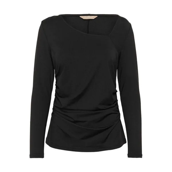 Dames top met lange mouwen en een moderne asymmetrische halslijn. Slanke pasvorm en zachte stof bieden comfort en stijl. Subtiele plooien aan de zijkant zorgen voor een flatterend accent. Geschikt voor diverse gelegenheden.