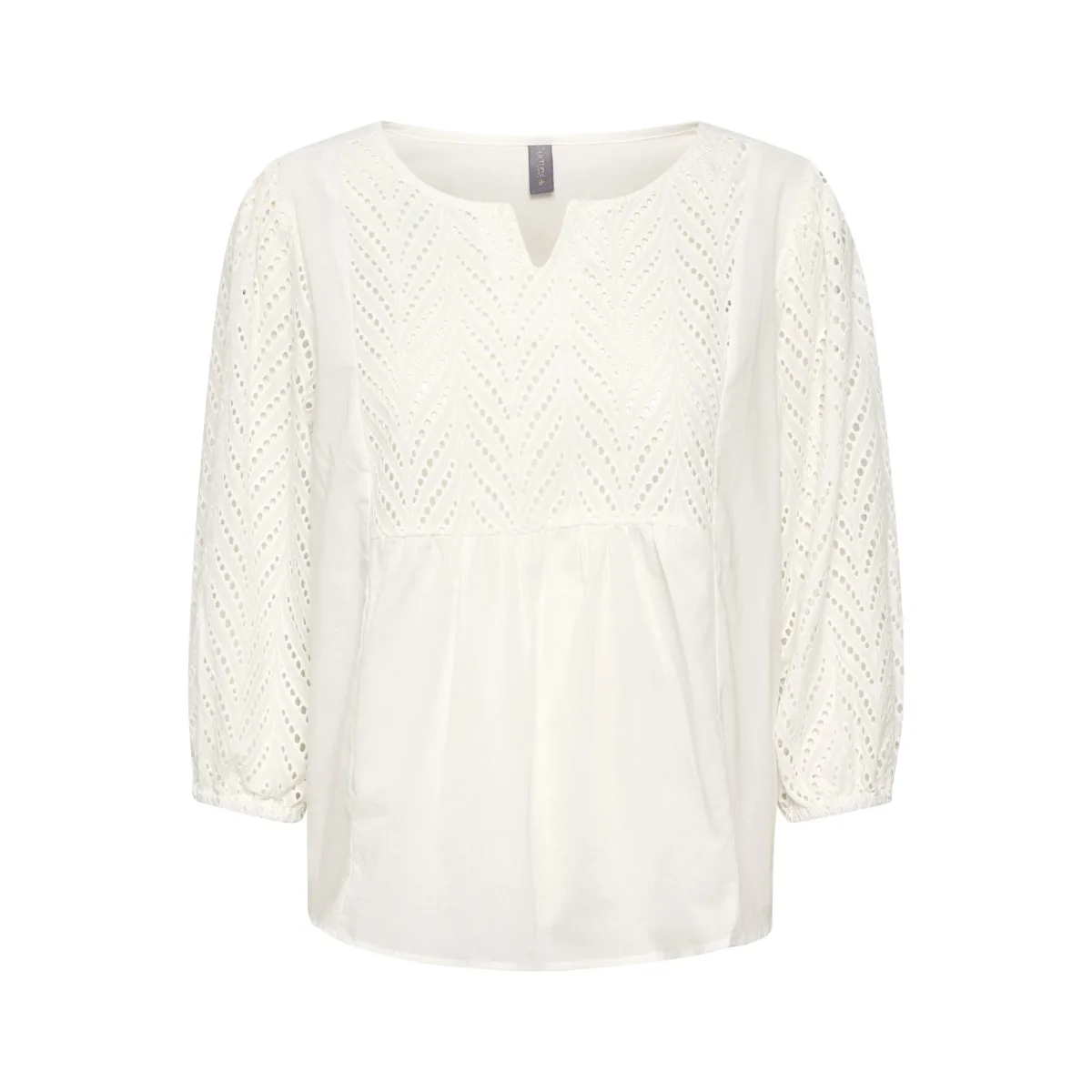 Blouse type: Blouseshirt; Design: Gevoerde zoom/rand, Rechte zoom; Materiaal: Katoen; Motief: Effen; Kraag: Zonder kraag; Details: Gedrapeerd, Mesh; Extra's: Licht transparant, Op staal naden; Pasvorm: Losse pasvorm; Armlengte: Driekwart mouw; Lengte: Normale lengte